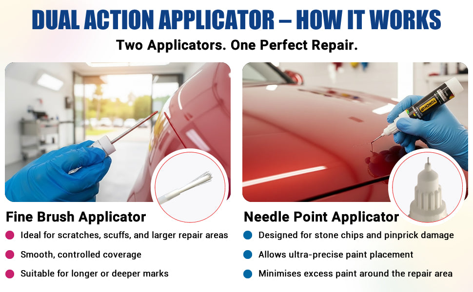 Use the pen’s 2-in-1 needle point or brush to fill the chip or scratch carefully. Apply in thin layers for best results.
